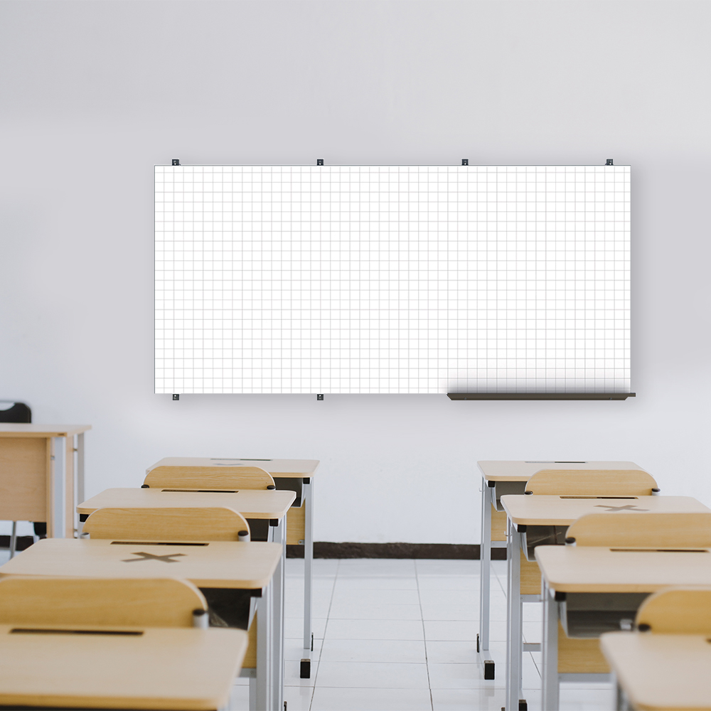 O modelo QB-01 possui superfície escrita de laminado melamínico de alta pressão (fórmica) na cor branco brilhante quadriculado 5 x 5 cm, com espessura mínima de 0,8 mm.