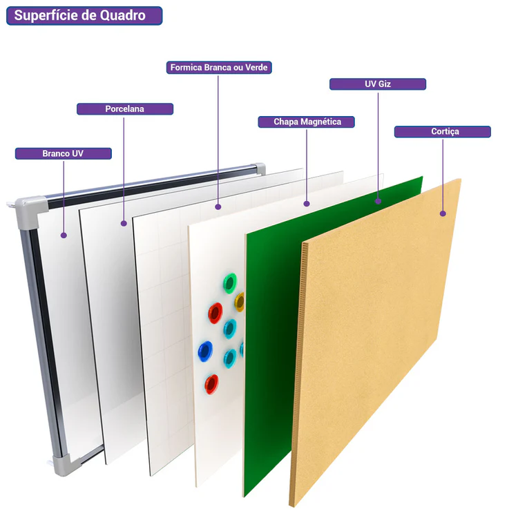 Temos opções que quadros brancos UV, quadros verdes de giz UV e quadros pretos de giz UV, e você encontra tanto lisas, quadriculadas e borderless.