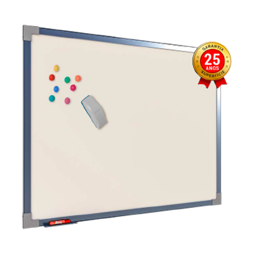É para escrita a seco com marcadores de quadro branco e possui bordos do painel encabeçados com fita de bordo em PVC (cloreto de polinivinila) com “primer”, 1,5 mm (espessura), na cor cinza.